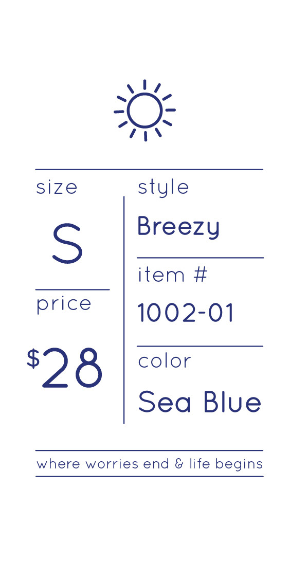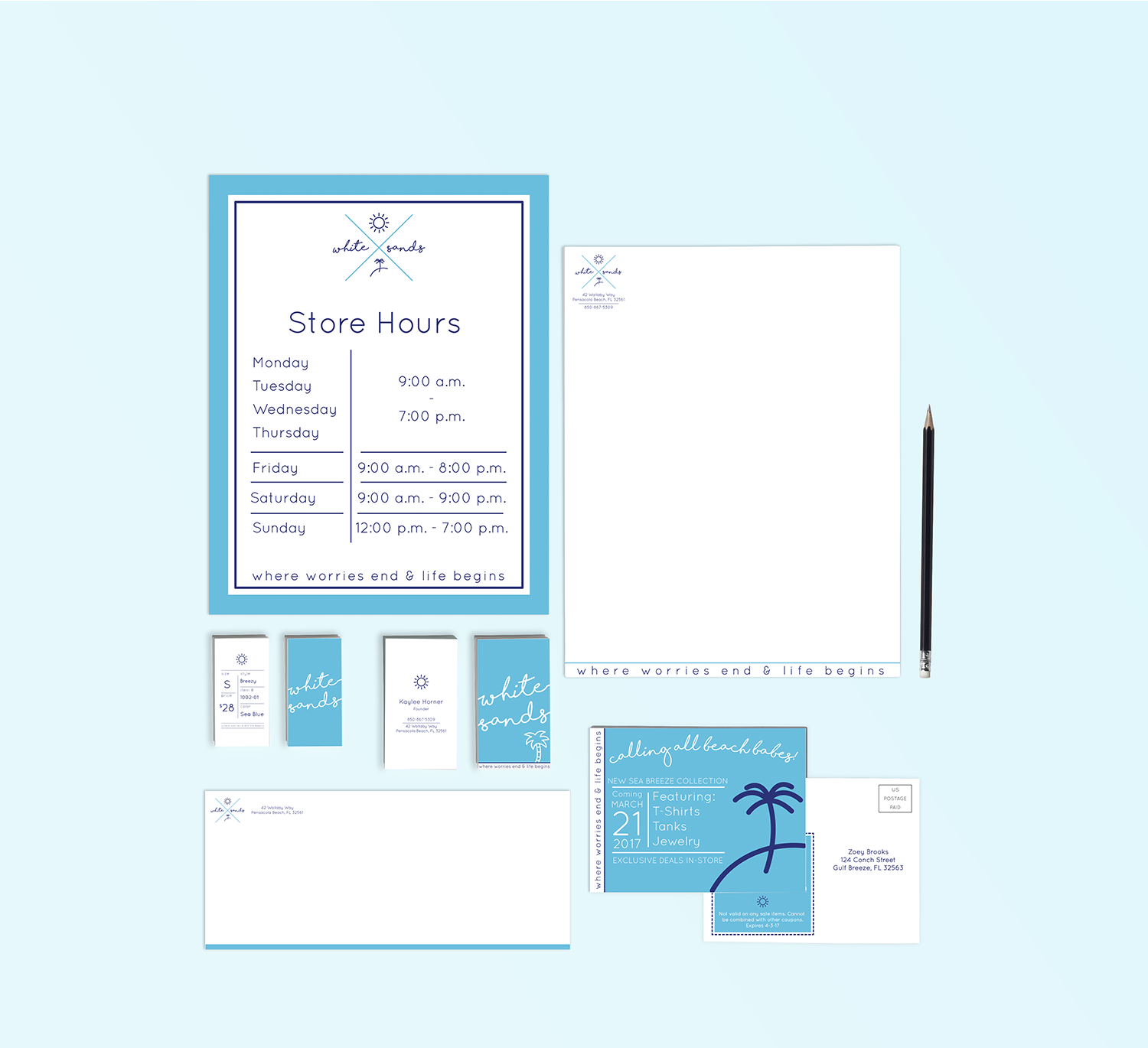 Process: The slogan, "Where worries end and life begins" embodies the idea of vacation being a relaxing time with no worries about life and to hang out stress-free. With that in mind, I knew the main color range needed to be shades of blue. Blue is a relaxing color and is consistently seen across beach related items. The font needed to feel fun and carefree, the feeling I wanted my brand to convey. The logo was created using the pen tool in Illustrator. I made sure to use elements that could be played with when designing the collateral.